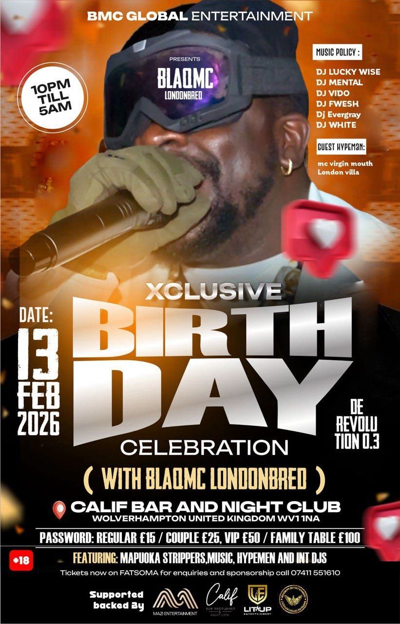 EXCLUSIVE BIRTHDAY CELEBRATION at Calif Bar, Wolverhampton on 13th Feb 2026. Buy tickets in just 2-clicks with our super-fast checkoutDisclaimer: