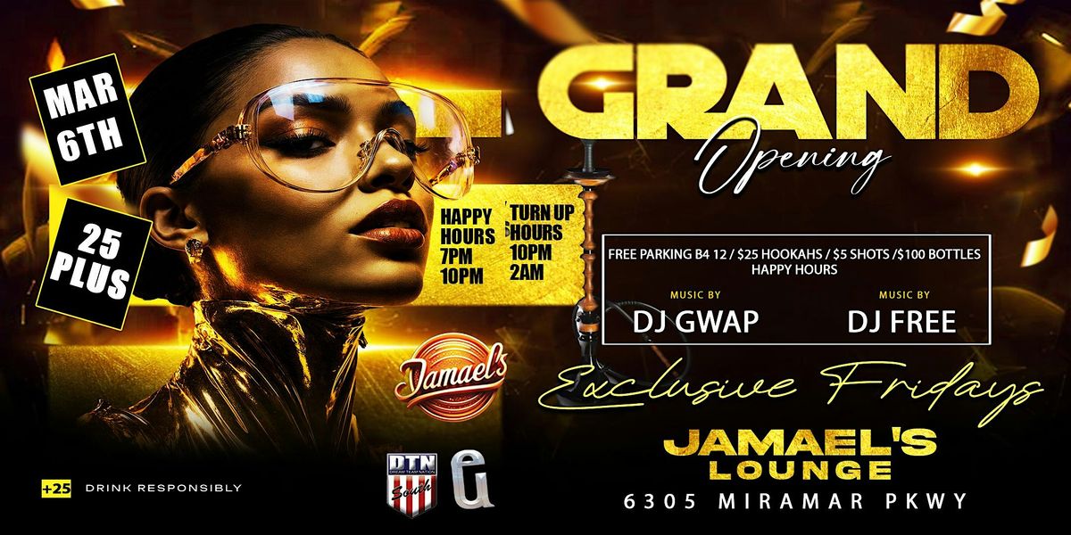 Happy Hours from 7PM-10PM Turn Up time 10PM-2AM . Ladies in free with RSVP reserve. $25 Hookahs / $100 Bottles B4 10PM. At Jamael's