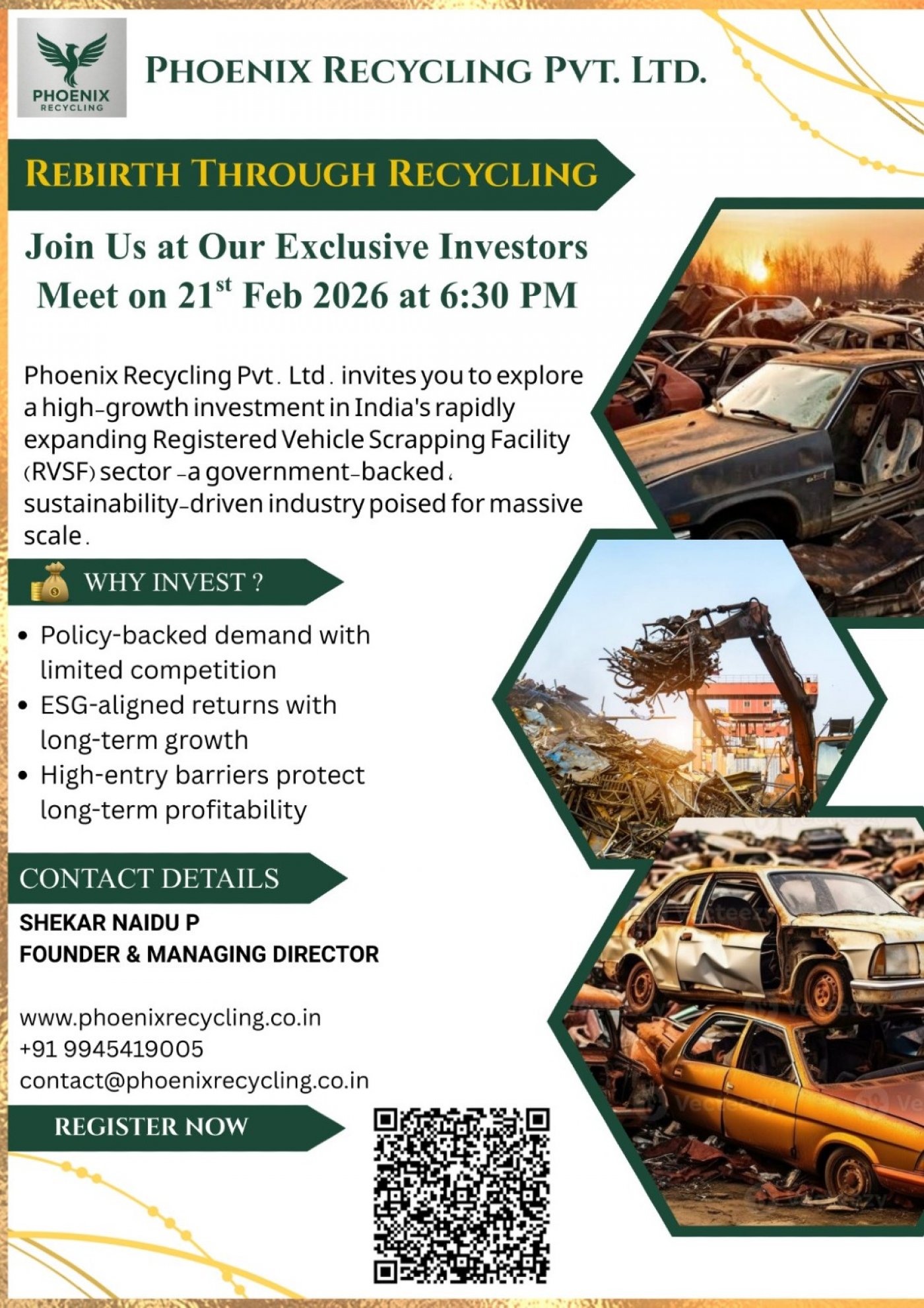 Phoenix Recycling Pvt. Ltd. invites you to explore a high-growth investment in India's rapidly expanding Registered Vehicle Scrapping Facility (RVSF) sector -a government-backed, sustainability-driven industry poised for massive scale.