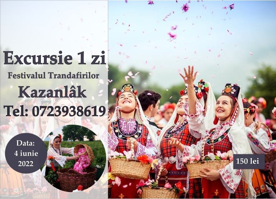 În data de 4 iunie 2022(sâmbătă), vă invităm într-o excursie de o zi la vecinii noştri bulgari pentru a participa la cel mai important festival din Bulgaria.Festivalul Trandafirilor se organizează în Kazanlak începând cu anul 1903. El celebrează adânca legatură a poporului bulgar cu floarea de trandafir (Rosa Damascena) şi cu toate darurile pe care le oferă aceasta floare (uleiul de trandafir).