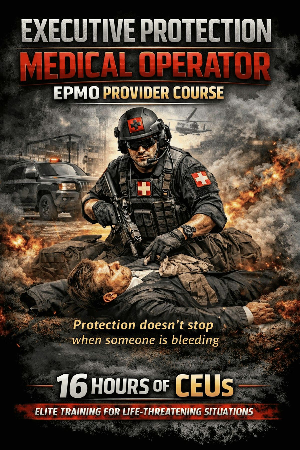 Executive Protection Medical Operator (EPMO) is a hands-on tactical medical training course designed for executive protection and protective services professionals operating in civilian environments.