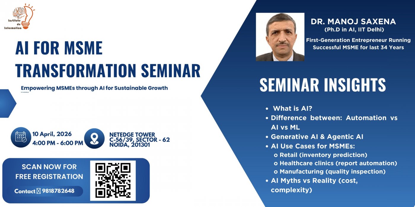 Join this exclusive executive seminar by Institute de Informatica (IDI) to explore how Artificial Intelligence is transforming MSMEs. Designed for business owners and decision-makers, this session simplifies AI concepts and highlights practical use cases across retail, healthcare, and manufacturing.