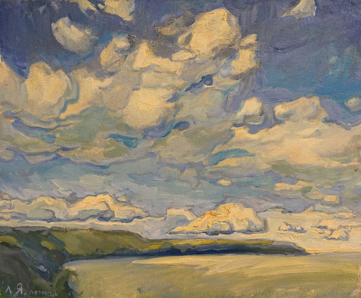 There’s no finer way to disrupt what disturbs than a lovely day. An expansive view along the water’s edge, a forest hike over rich green moss, a blustery wind sweeping clouds across deep blue sky. To capture that light, that open feeling when human stress gives way to Mother Nature’s sensual beauty, we paired two artists whose paintings evoke just that: a welcomed reset. Returning gallery favorites Lizzie Butler of the United Kingdom and Jaroslav Leonets of Ukraine seduce us into the vistas themselves. Some of the land and waterscapes are stark, others are abstract. All beckon with elegant, understated color in mesmerizing form.