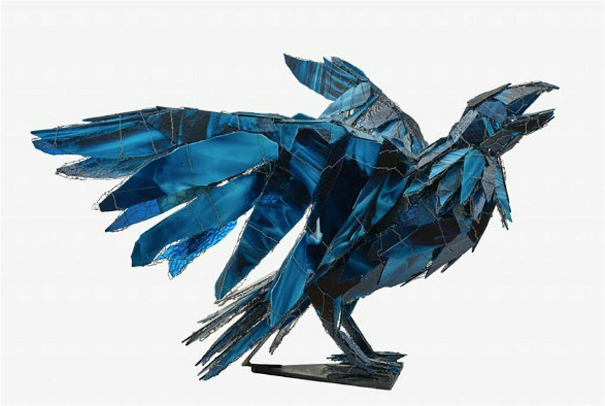 Image: Amethyst Raven and Frog 2023. Metal and glass, 42 x 22 x 26 inches