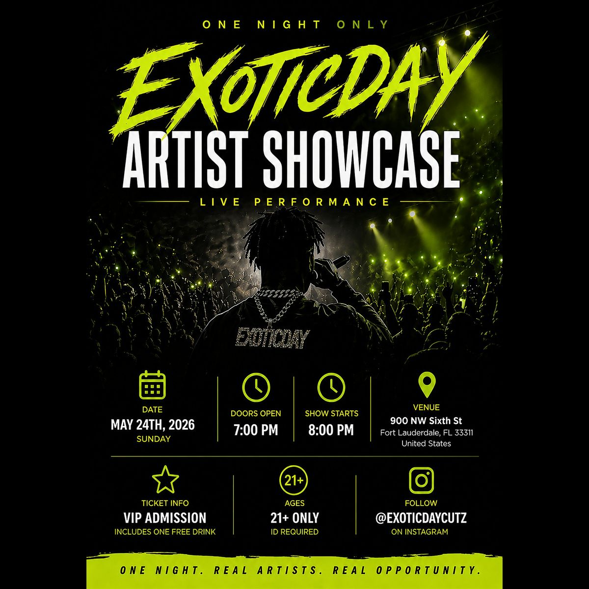 ExoticDay Artist Showcase — live performances, rising artists, and VIP tickets with a complimentary drink. Fort Lauderdale • 21+