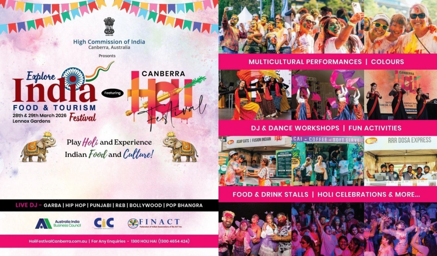 The High Commission of India, Canberra cordially invites you to a TWO-DAY explore India Food & Tourism Festival featuring Holi celebration extravaganza on 28th & 29th of March 2026 at Lennox Gardens