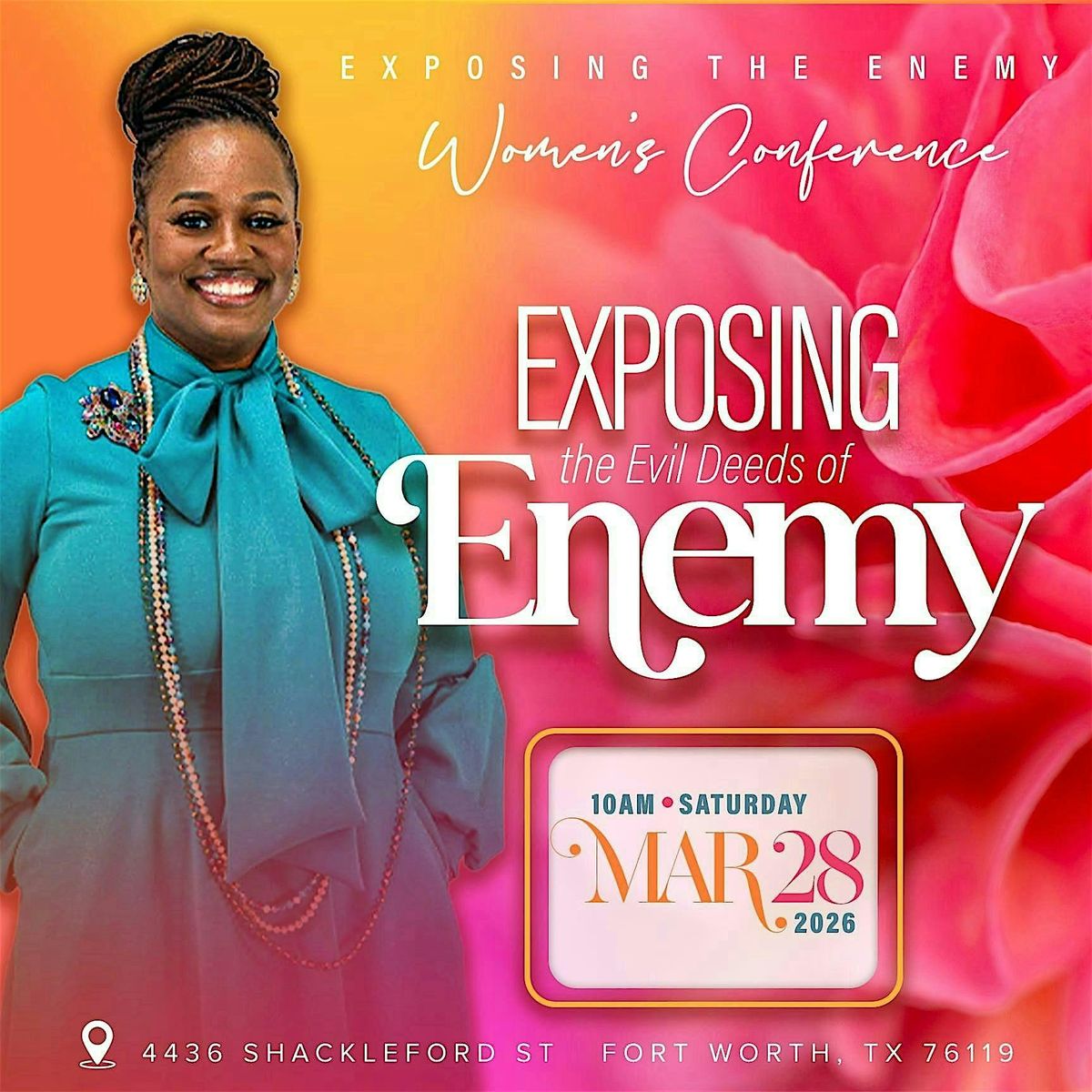 Join us for an inspiring in-person gathering at the Exposing the Enemy Women’s Conference! Connect with amazing women, hear testimonies, and discover powerful ways to overcome the evil devices of our enemy together. Don’t miss out on a day filled with fun, faith, and fellowship. Let’s stand strong and uplift each other in this incredible event!