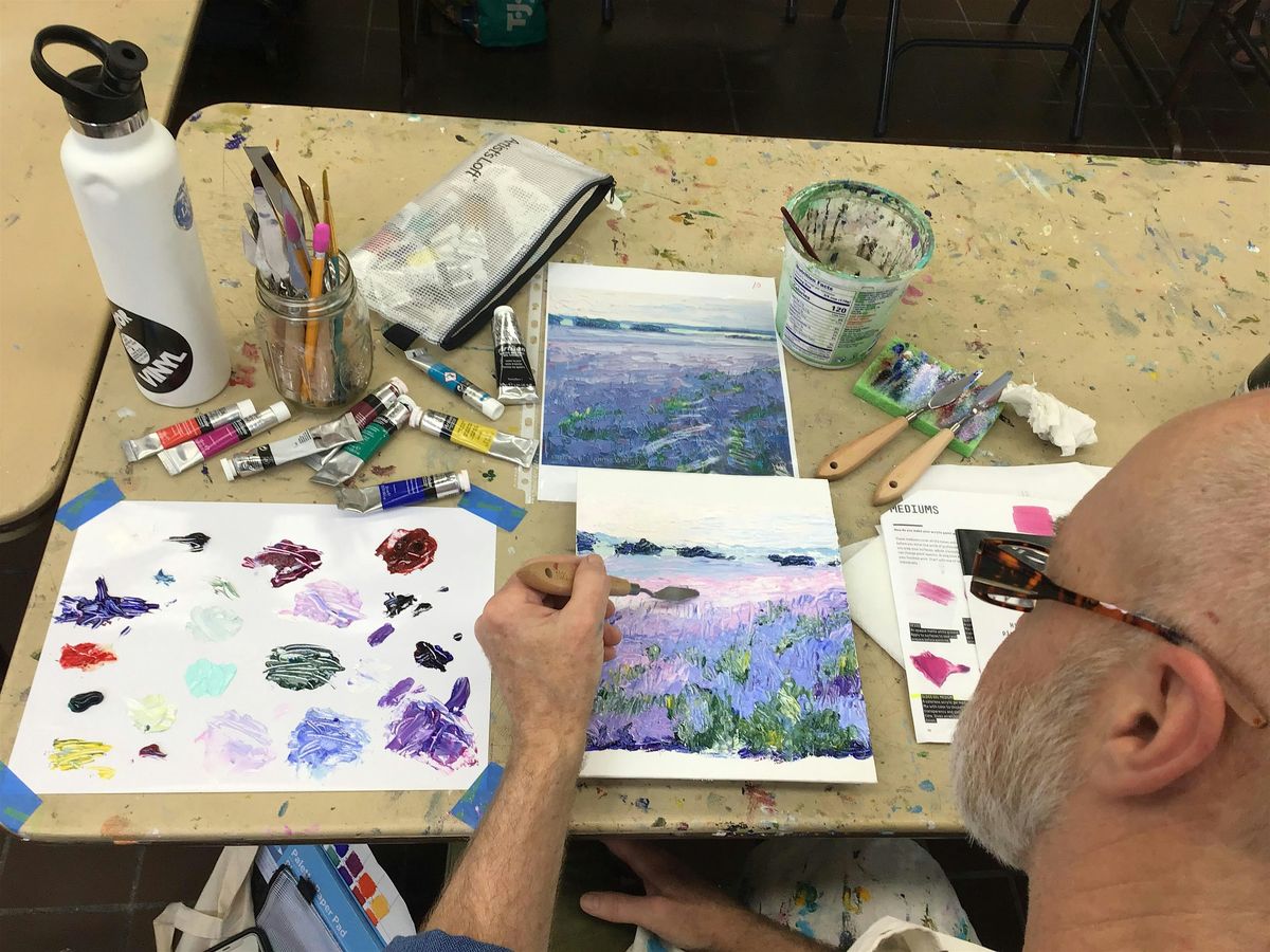 No drawing skills required, as you're learning more about in-the-moment color blending rather than planned proportions and detail. Create two 5x7 paintings! Bring your own box to safely get them home, as they will need several hours drying time.