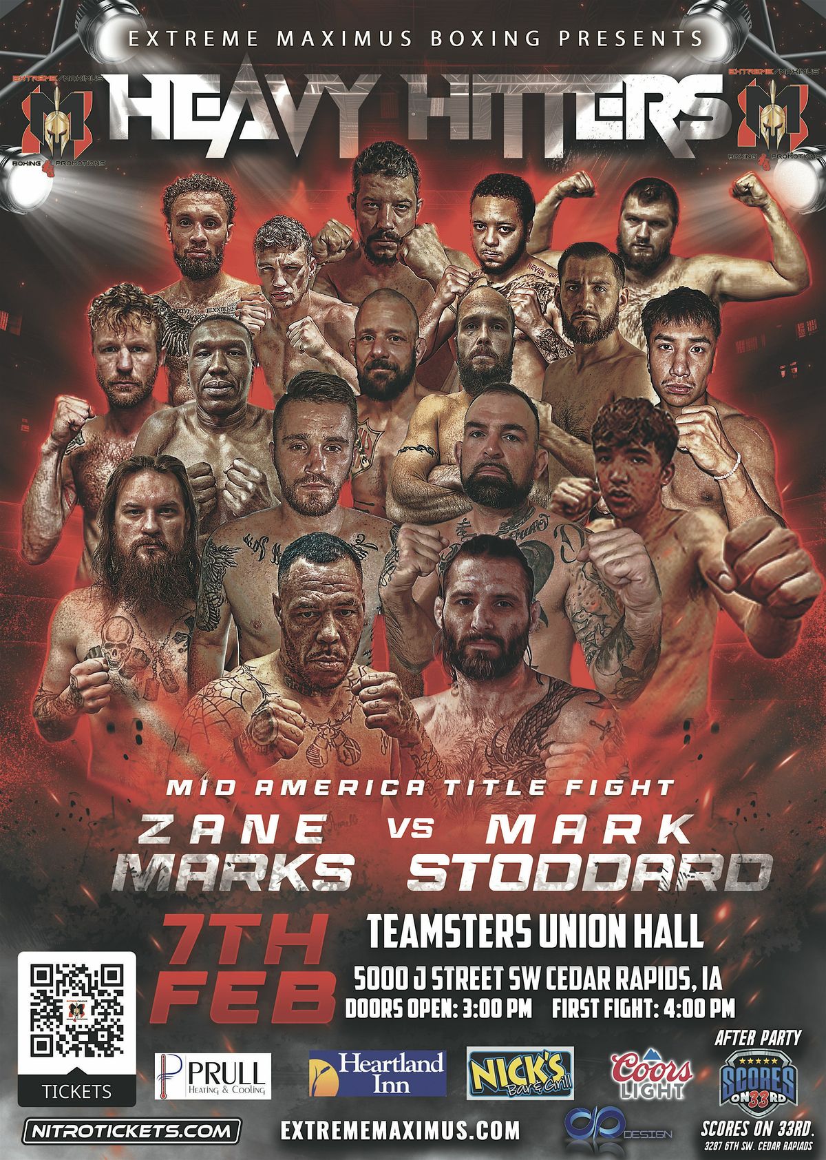 Another full card of professional boxing and kickboxing is scheduled Feb. 7 at Teamsters Union Hall in Cedar Rapids.A total of 16 fights are scheduled with a showdown between Zane Marks of Cedar Rapids and Mark Stoddard of Clinton for the USA Mid American Light Heavyweight Championship.Doors open at 3 p.m. with the first bout at 4 p.m. If you can't attend, the entire event will be shown live on BXNGtv. (See bxngtv.com to order)