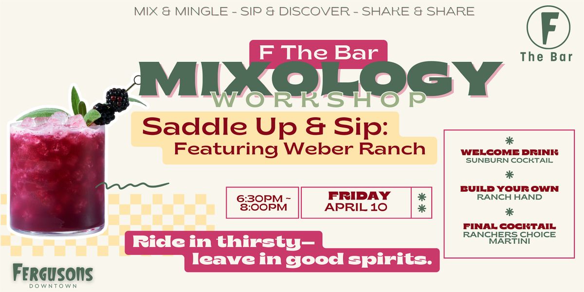 Join us at F the Bar for Saddle Up & Sip, our April Mixology Workshop featuring Weber Ranch Vodka—a hands-on night built around fresh ingredients, bold flavors, and cocktails with a little frontier spirit. Whether you’re riding in with friends, bringing a date, or flying solo, this workshop is all about good company and great pours.