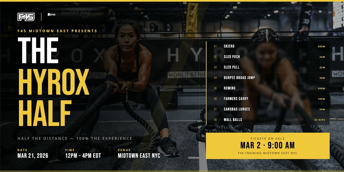 Welcome to the ultimate fitness challenge! Join us for the F45 x Hyrox Event where you'll push your limits and test your strength. We have designed an exact replica of the Hyrox competition, just cut it in half. Each station will be half the length you would compete in for the actual event. You can experience exactly what it feels like to complete the entire race!
