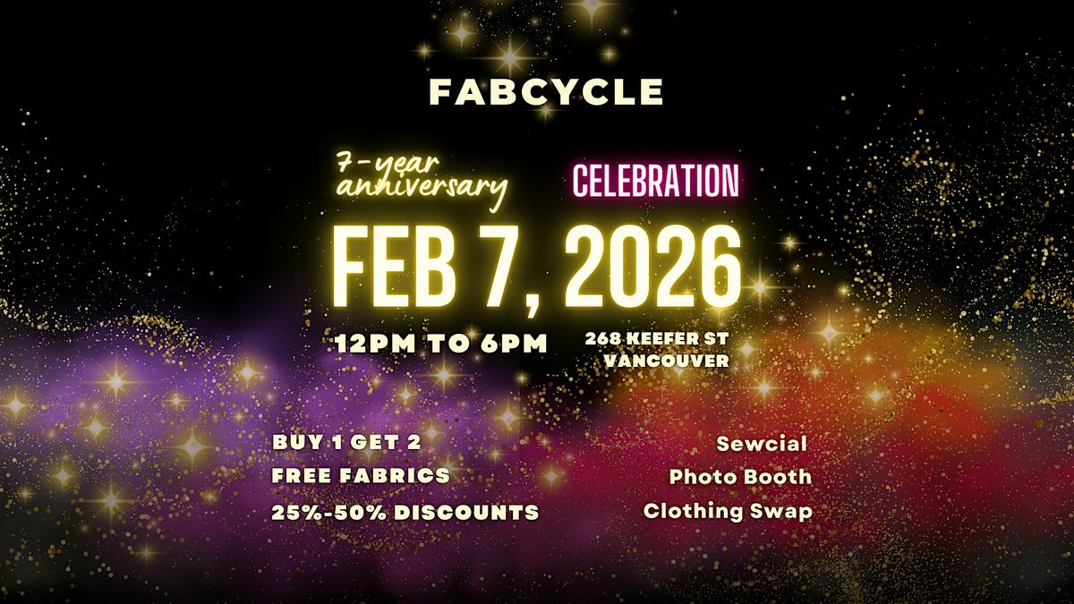 Celebrate 7 years of FABCYCLE on Feb 7! Free community event with a Sewcial, Clothing Swap, Photo Booth, and HUGE in-studio SALE.