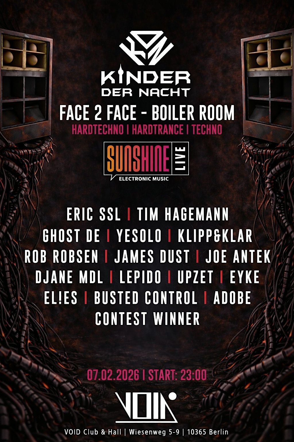 Face 2 Face – Boiler Room FLOORS & SOUNDS VOID HALL Fetter Hardtechno / Hardtrance im Boiler-Room Face-to-Face Style. Der DJ direkt mitten in der Crowd. RAVE SECTOR Feinster Trance & Hardtrance mit Eric SSL (Sunshine Live Classics) und James Dust aus der Schweiz als Special. BASEMENT FLOOR Treibender, hypnotischer Techno u. a. mit Joe Antek von der @mayday_dortmund . LINE-UP & CREW DJ’s vom legendären Sunshine Live Radio, sowie Artists aus Berlin und der @piepshow_berlin – @kitkatclub.official . Werde ein Teil davon. Tanz mit uns ! 07.02.2026 Start 23:00 Uhr VOID CLUB BERLIN / VOID HALL KINDER DER NACHT