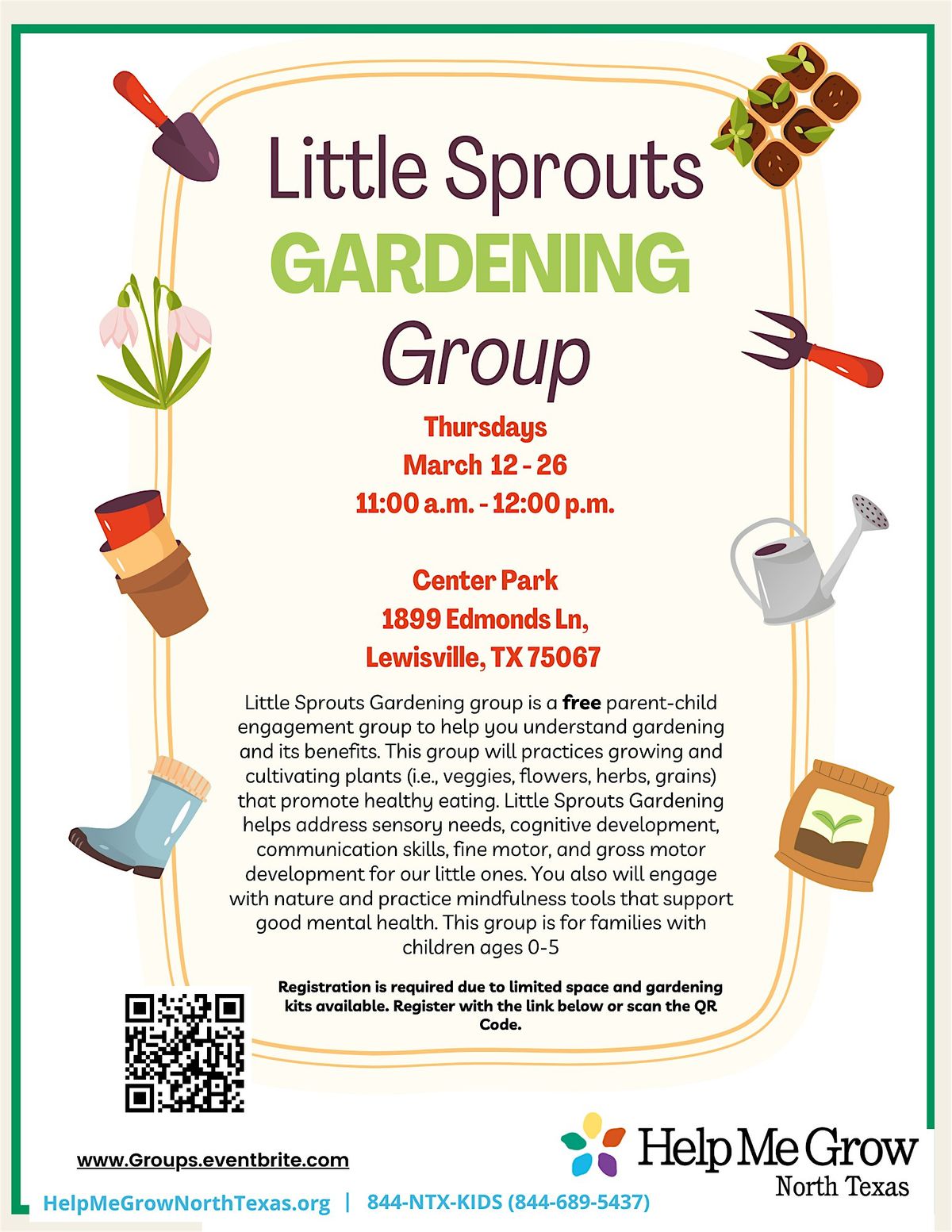 El grupo de Jardinería Little Sprouts es gratis para padres e hijos y se enfoca en comprender la jardinería y sus beneficios. Este grupo practicará el cultivo de plantas (verduras, flores, hierbas y granos) para promover una alimentación saludable. En el grupo de Jardinería Little Sprouts nuestros pequeños practicaran las habilidades sensoriales, cognitivas, comunicativas y la motricidad fina y gruesa. Las familias también se conectarán con la naturaleza y practicarán habilidades de atención plena para una buena salud mental. .