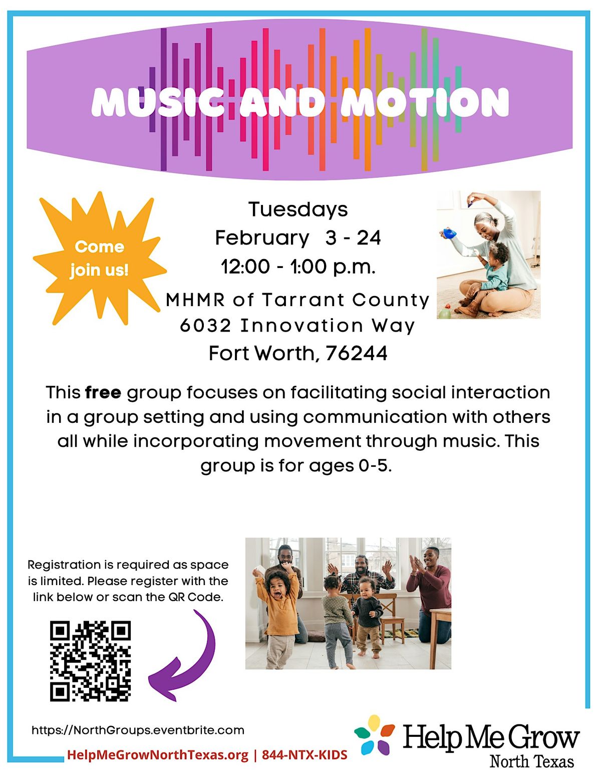This free group focuses on facilitating social interaction in a group setting and using communication with others all while incorporating movement through music.
