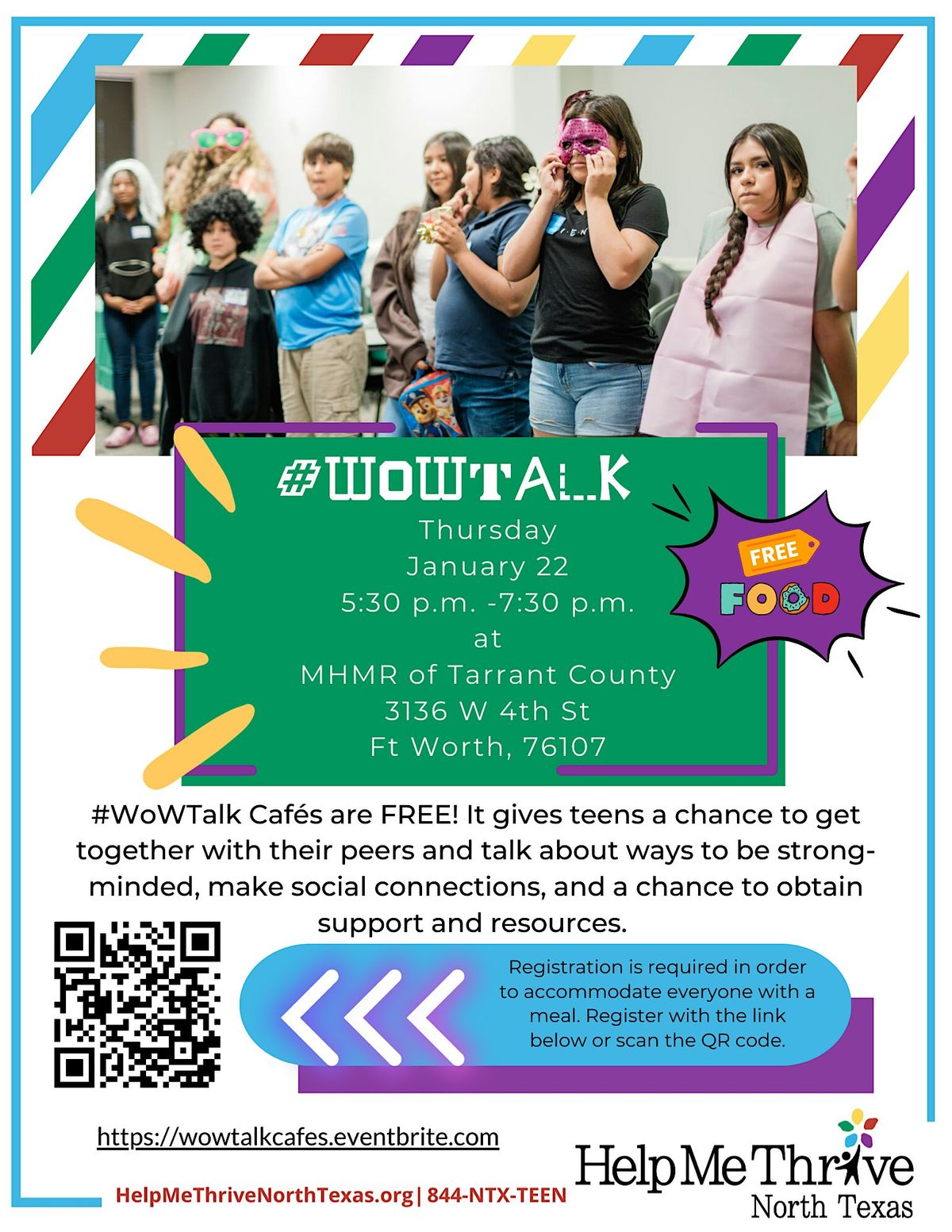 #WoWTalk Cafés are free! It gives teens a chance to get together with their peers and talk about ways to be strong-minded, make social connections, and a chance to obtain support and resources. This is for ages 11-17.