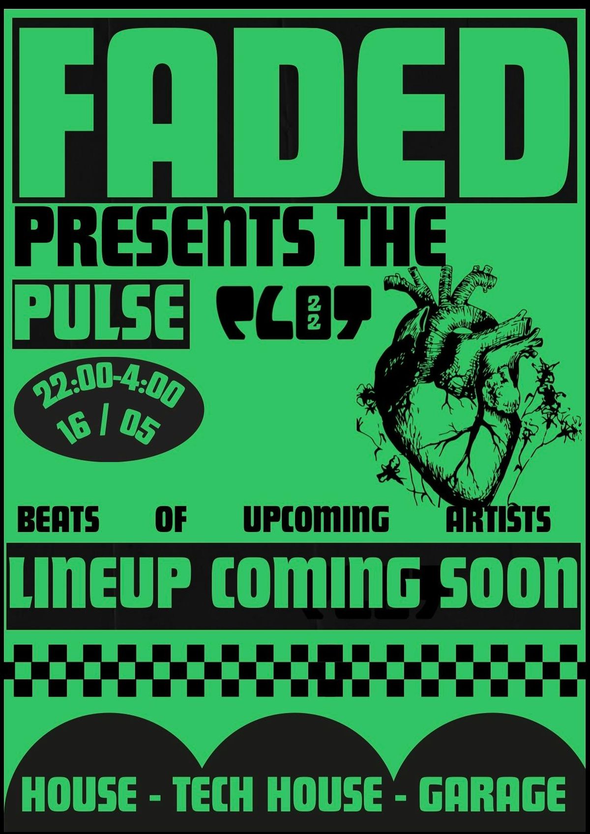FADED EVENTS bring ‘The Pulse’ to Plot 22 for the second time round, if you was there for our first time at Plot you will know how it went down, unbelievable.Bringing you a range of selectors from across the city, including some familiar faces and new, expect tech house beats, underground hitters, SlapFunk wobblers and a hint of piano😏