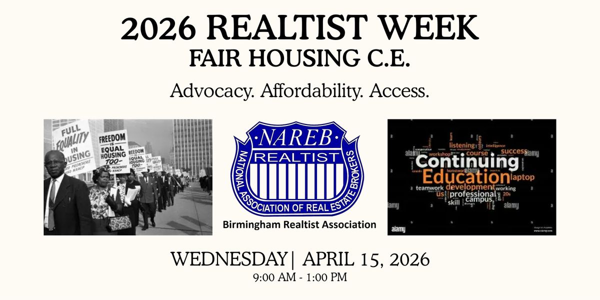 Join the National Association of Real Estate Brokers (NAREB) and the Birmingham Realtist Association for an informative and impactful Fair Housing Continuing Education (C.E.) session during Realtist Week.