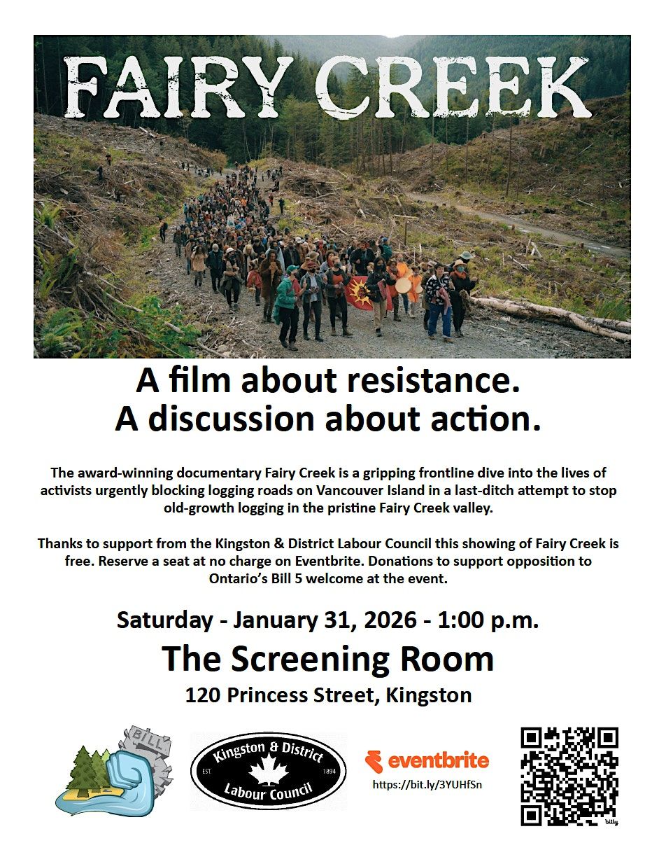 Thanks to support from the Kingston & District Labour Council this special showing of Fairy Creek is free. Reserve a seat at no charge on Eventbrite. Bring a friend. Donations to support opposition to Ontario’s Bill 5 welcome at the event.