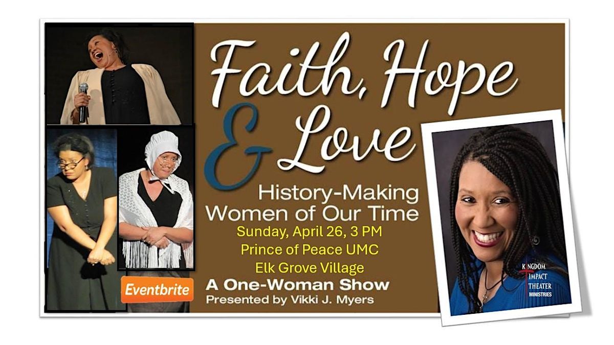 Vikki J. Myers, co-founder and director of worship of Kingdom Impact Theater Ministries, will present a revival of her monologue and music performance, "Faith, Hope and Love: History-Making Women of Our Time," returning to Elk Grove Village with a 3 PM. performance on Sunday, April 26, at Prince of Peace United Methodist Church.