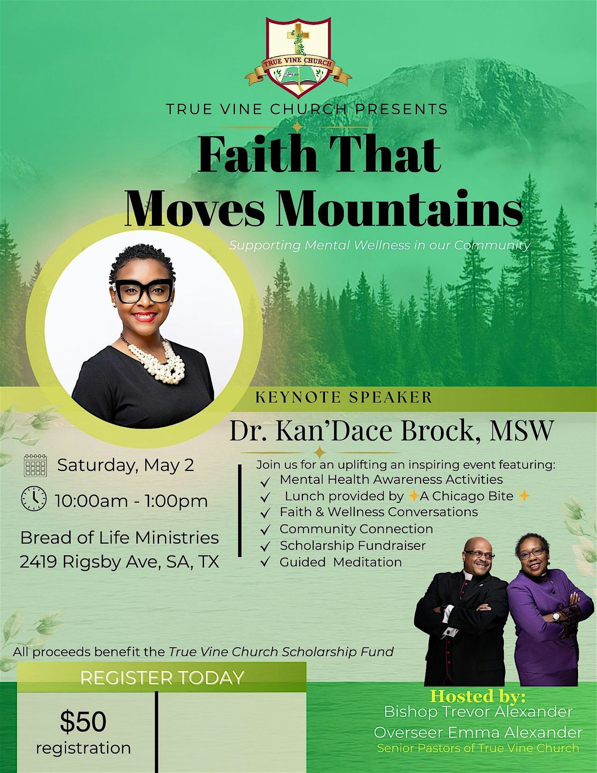 Join us in person for an inspiring event all about discovering the power of faith to overcome any obstacle. This event will include Mental Health Awareness activities, lunch, guided mediatation, and Faith & wellness conversations. Whether you're looking for motivation or a fresh perspective, this gathering will lift your spirit and fuel your journey. Come connect, be encouraged, and experience how faith really moves mountains in everyday life!