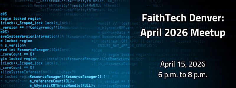 Welcome to the FaithTech Denver April 2026 Meetup! Join us on Wed, April 15, 2026 at 6:00 PM at the Denver Institute for Faith and Work for an evening of networking, learning, and collaboration.