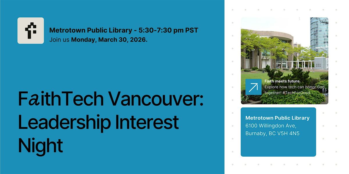 FaithTech is a global movement in 45+ cities across 20+ countries, and we're building it here in Vancouver. Join us in person as we share our vision for 2026 and explore opportunities to serve on the FaithTech Vancouver leadership team.