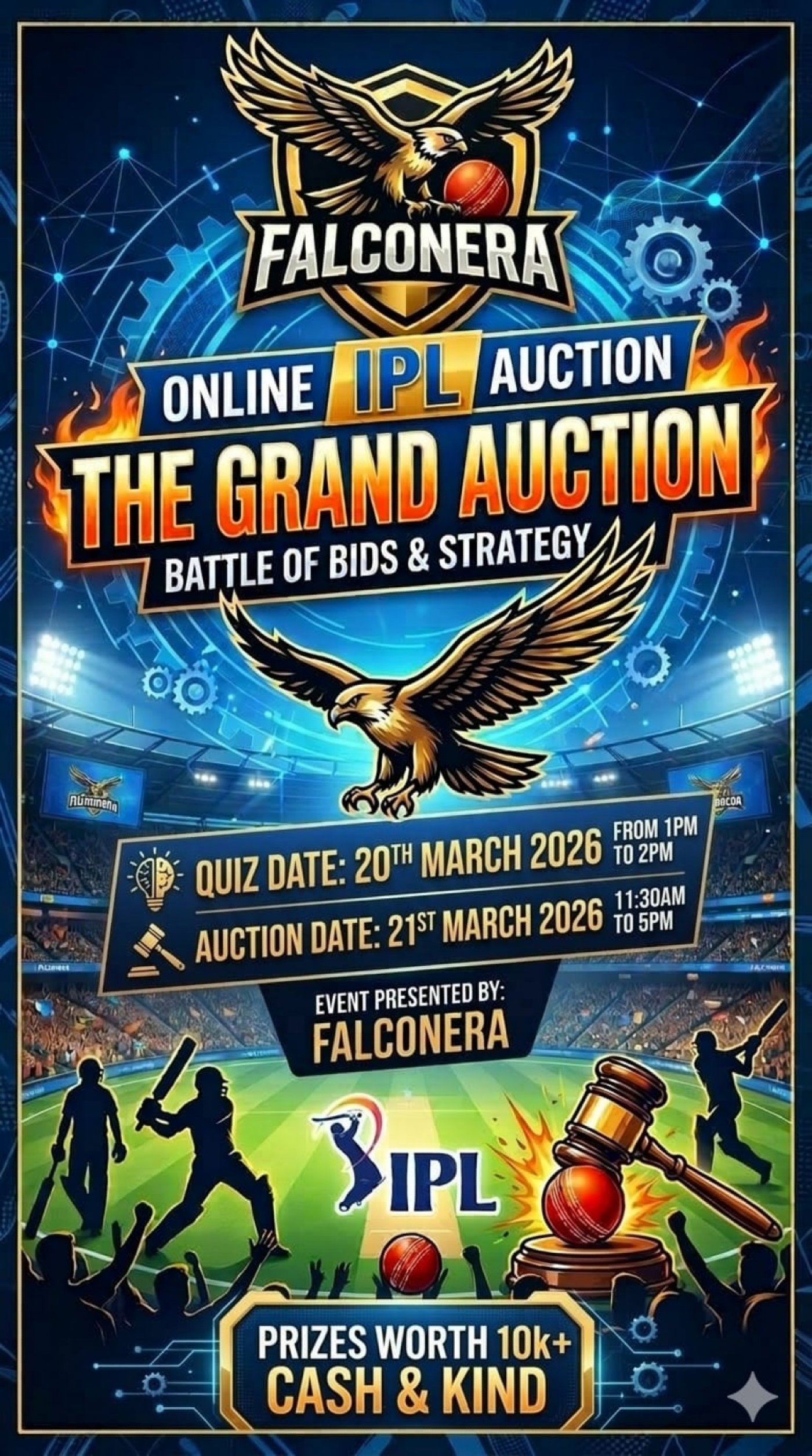 FALCONERA presents IPL – AUCTION, a strategic IPL-style virtual auction simulation where participants build their dream squad using a fixed budget. The event tests decision-making, bidding accuracy, teamwork, and cricketing knowledge.