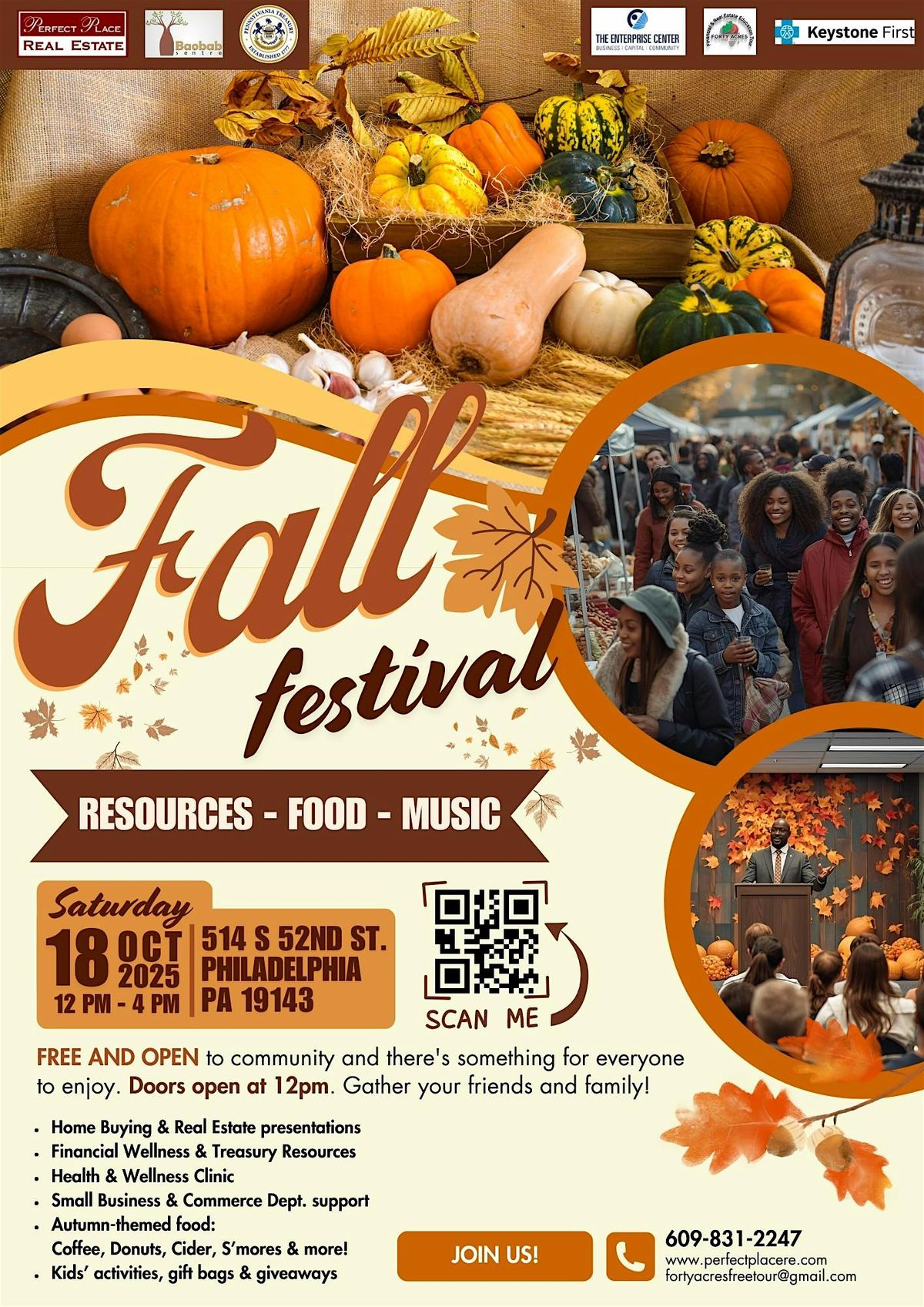 Perfect Place Real Estate, the Baobab Sentre and the Forty Acres F.R.E.E. Tour are having a Fall Festival, an event that brings financial, wellness and real estate resources (for business owners and homeowners/buyers) to the 52nd Street corridor, on Saturday, October 18th, from 12pm-4pm at the PPRE office at 514 S 52nd Street Philadelphia, PA 19143.