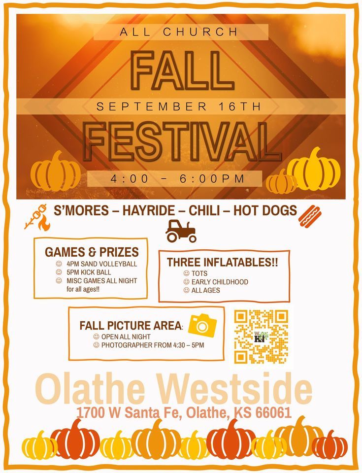 Hot dogs, chili, s'mores, hay ride, picture area, lots of games, prizes, and THREE inflatables!!- a tiny one for tots