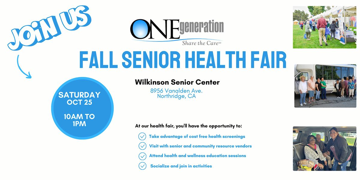 Attend this 2nd Annual Fall Senior Health Fair at the Wilkinson Senior Center in Northridge, from 10am to 1pm on Saturday, October 25th. Location is 8956 Vanalden Ave., Northridge, CA 91324.