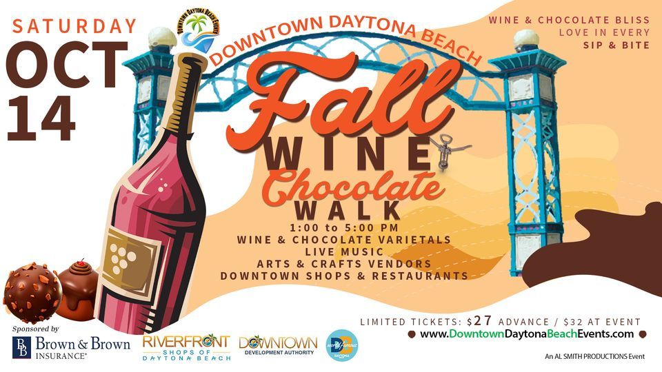 Spend a delightful afternoon at the Fall Wine & Chocolate Walk in historic Downtown Daytona Beach. Visit unique merchants, browse arts and crafts, and enjoy live music – all while sampling fine red and white wines and indulging in chocolate treats.
