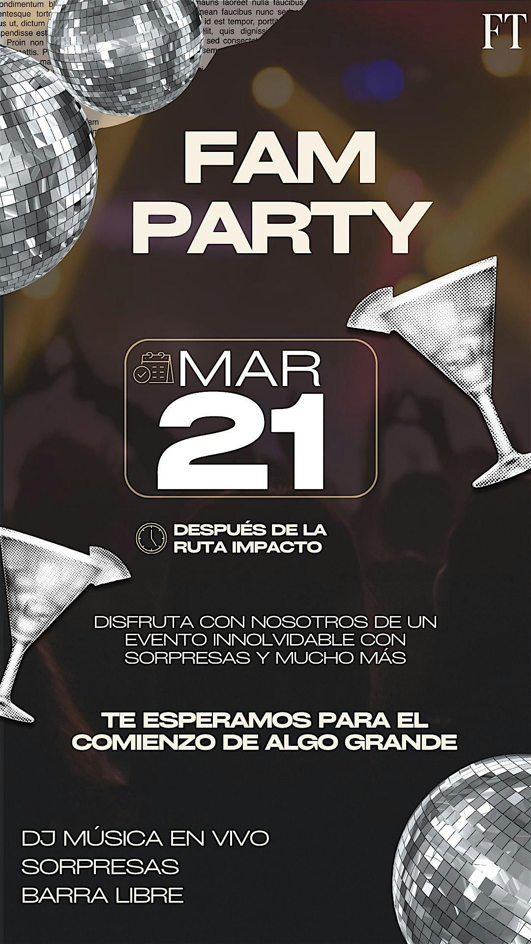 PRIMERA FAM TEAM PARTY! UN EVENTAZO QUE NO TE PUEDES PERDER! ES EVENTO EXCLUSIVO ÚNICA Y EXCLUSIVAMENTE PARA FI DE FAM TEAM. TE ESPERAMOS!About this Event
