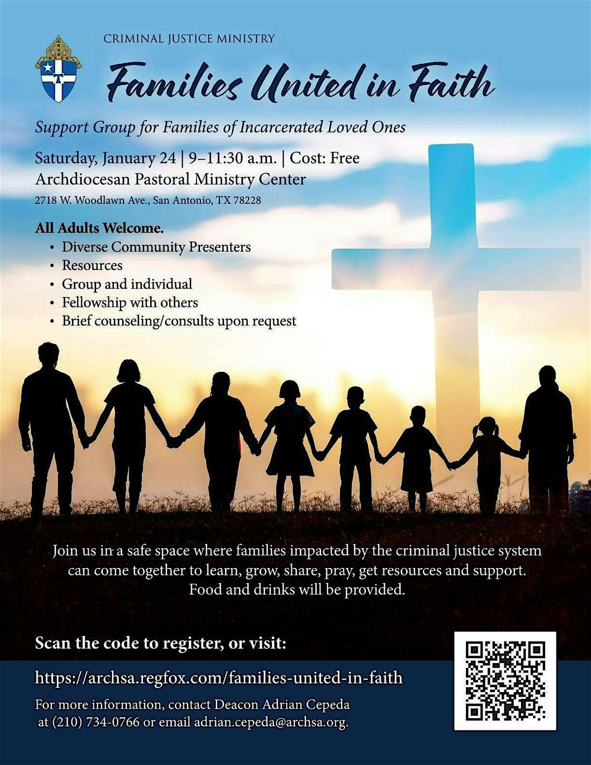 Join us in a safe space where families impacted by the criminal justice system can come together to learn, grow, share, pray, get resources and support. Food and drinks will be provided.