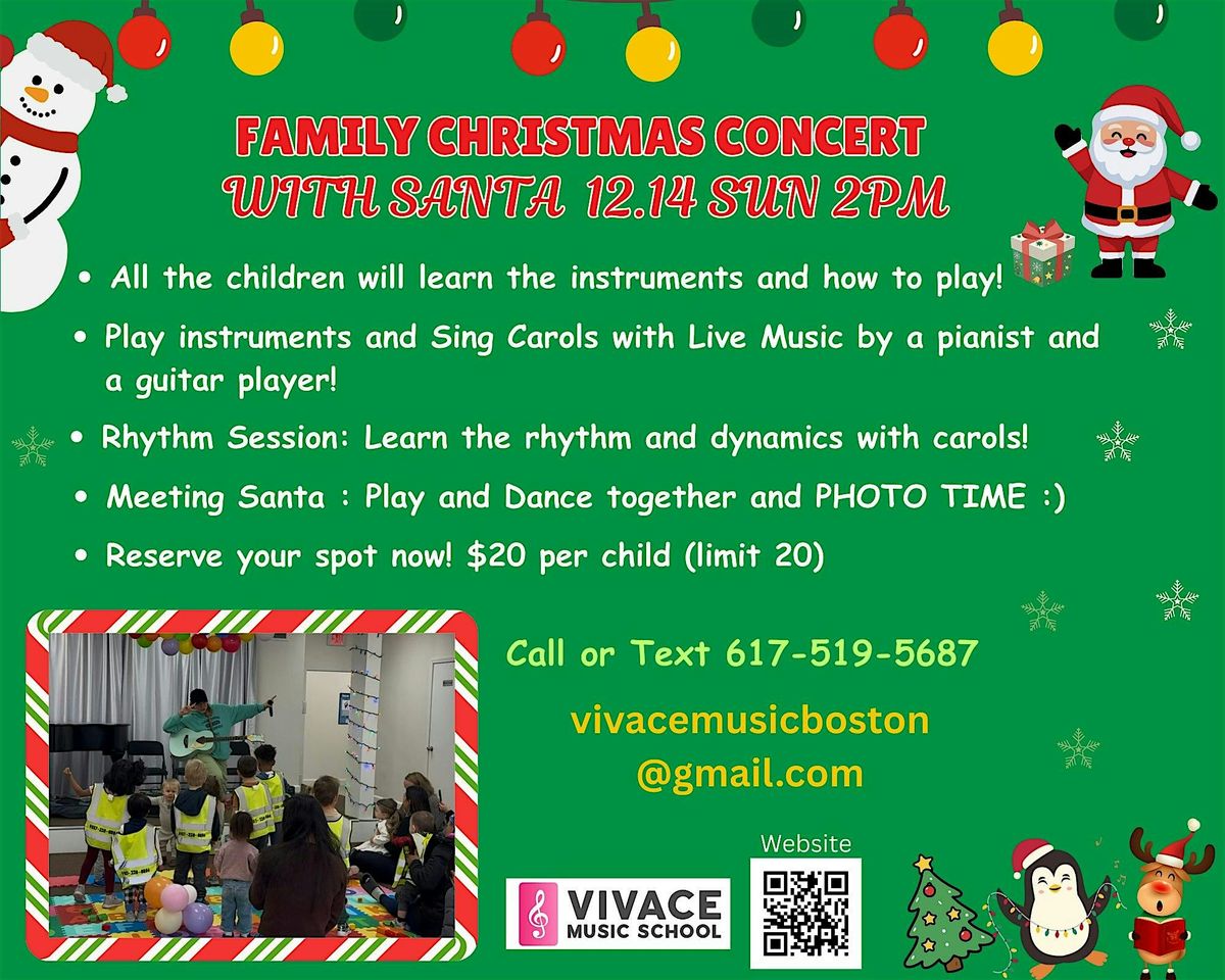 Get ready for a merry time at our Family Christmas Concert featuring a special visit from SANTA! Join us in person for an evening packed with festive tunes, holiday cheer, playing the instruments and lots of fun for all ages. Bring the whole family and celebrate the season with music, laughter, and some surprise appearances. Don’t miss out on this magical holiday event – it’s the perfect way to kick off your Christmas festivities!
