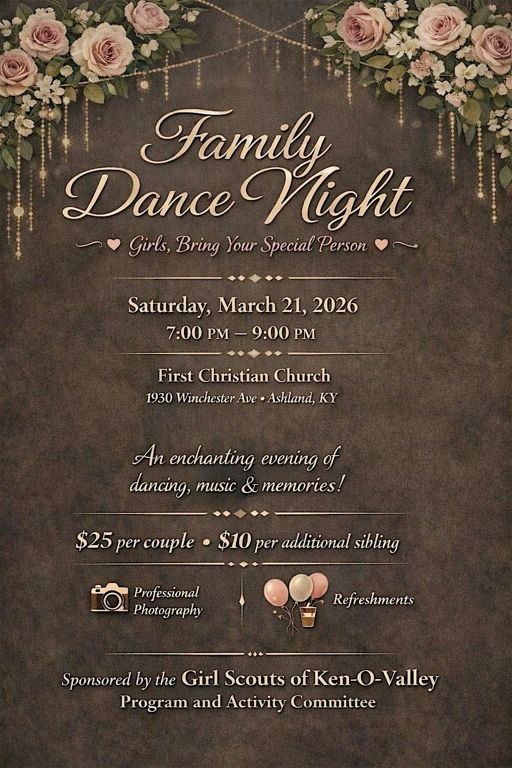 Family Dance Night will take place in the gym at First Christian Church in Ashland. Enter the doors on 19th Street. A professional photographer will be available for pictures and light refreshments will be provided. This event is open to Girl Scouts and any girl grades K-6!