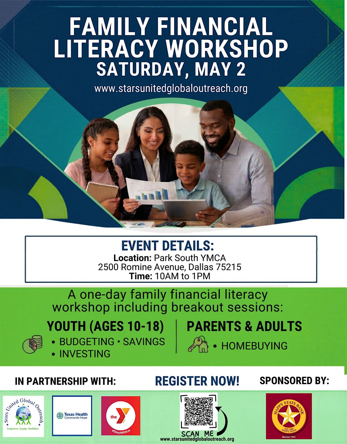 Join us for a Family Financial Literacy Workshop on Saturday, May 2nd, from 10:00 a.m. to 1:00 p.m. at the Park South YMCA. We’ve designed this day to empower the whole family with the tools they need to succeed!