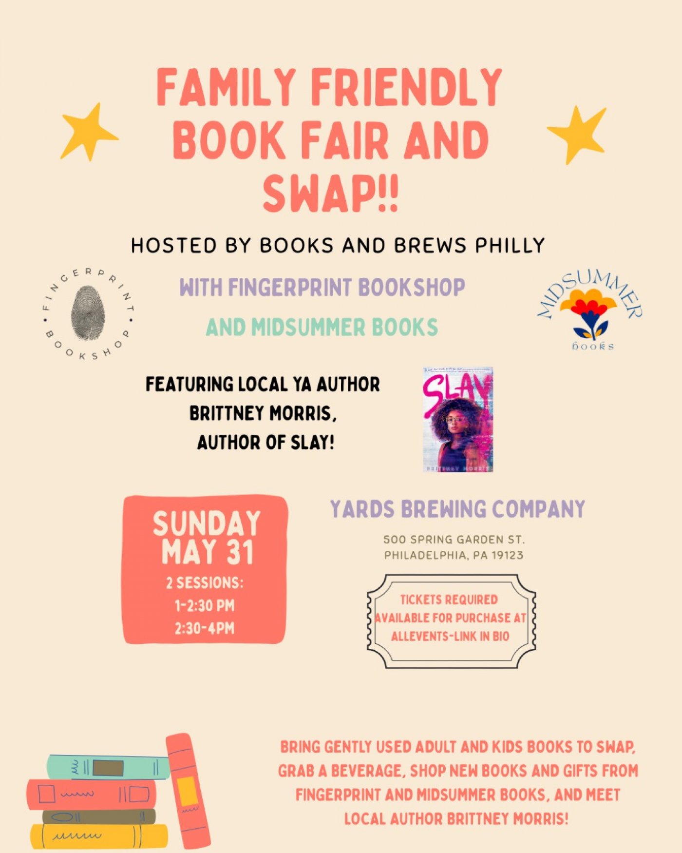 Books and Brews Philly is teaming up with Fingerprint Bookshop and Midsummer Books for an epic family friendly book fair and swap! We will also be joined by YA author Brittney Morris, author of Slay! Bring a gently used book (s) to swap, grab a beverage and shop kids and adult books, gifts and merch from Fingerprint and Midsummer! Kids 14 and under swap for free!