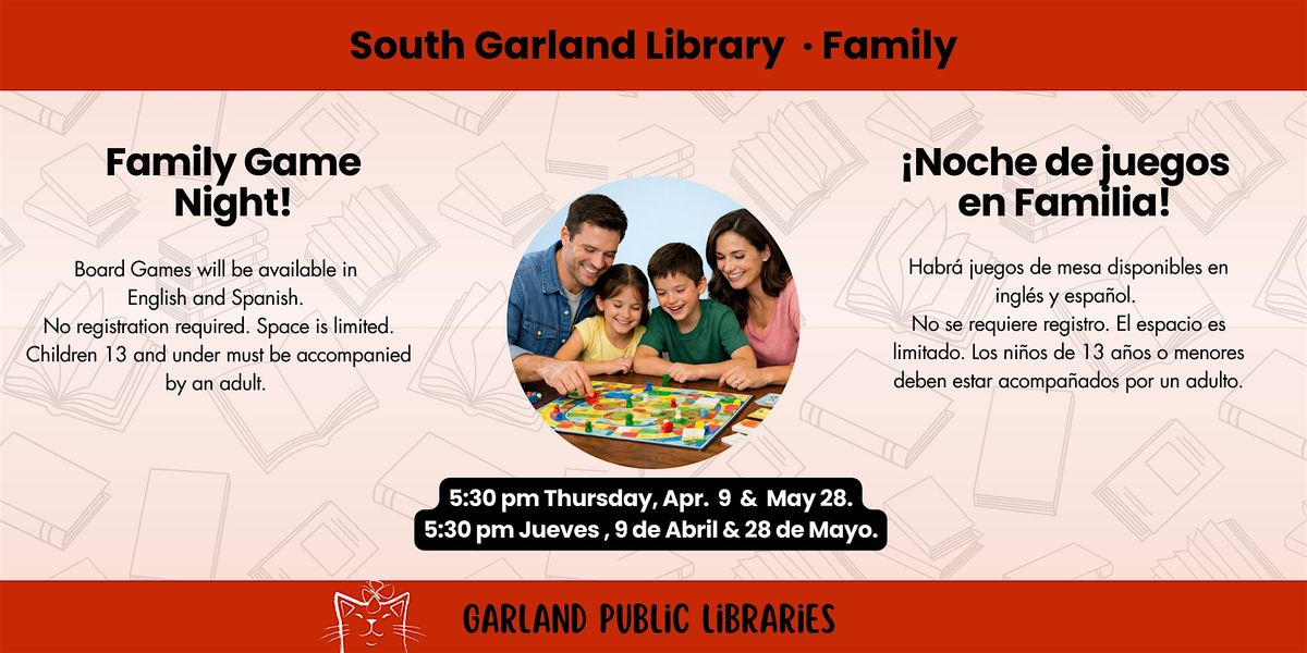 Disfruta de juegos clásicos y modernos en un ambiente agradable y acogedor. Juega con tu familia o amigos y conoce a otras familias y personas de tu comunidad. Juegos disponibles en inglés y español. Cupo limitado. Los menores de 13 años deben estar acompañados por un adulto.