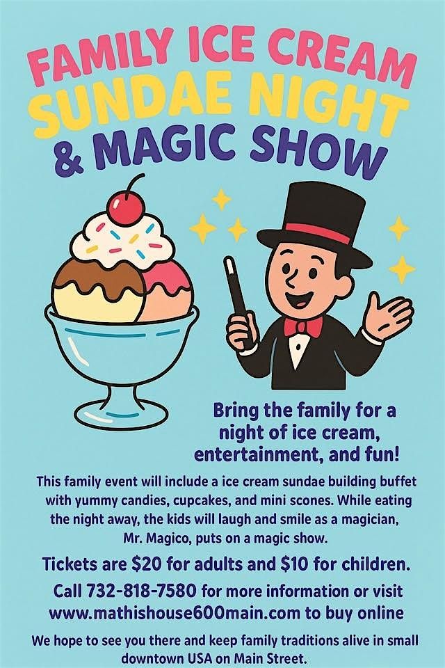 Happy Birthday, America! Celebrating 250 Years Family Ice Cream Sundae Night & Magic Show at the Mathis House. Bring the whole family for a sweet night of ice cream, entertainment, and fun at the Historic Mathis House in Downtown Toms River! The theme for the party is Red, White, and Blue with American Flags. A brief history of the Boston Tea Party will be given with cotton candy tea samples. Create your own sundae at our ice cream buffet, complete with yummy candies, cupcakes, and mini scones. While enjoying your treats, the kids will laugh and smile as the amazing Mr. Magico puts on a fun-filled magic show for all ages. Date: April 8th at 6:00 PM