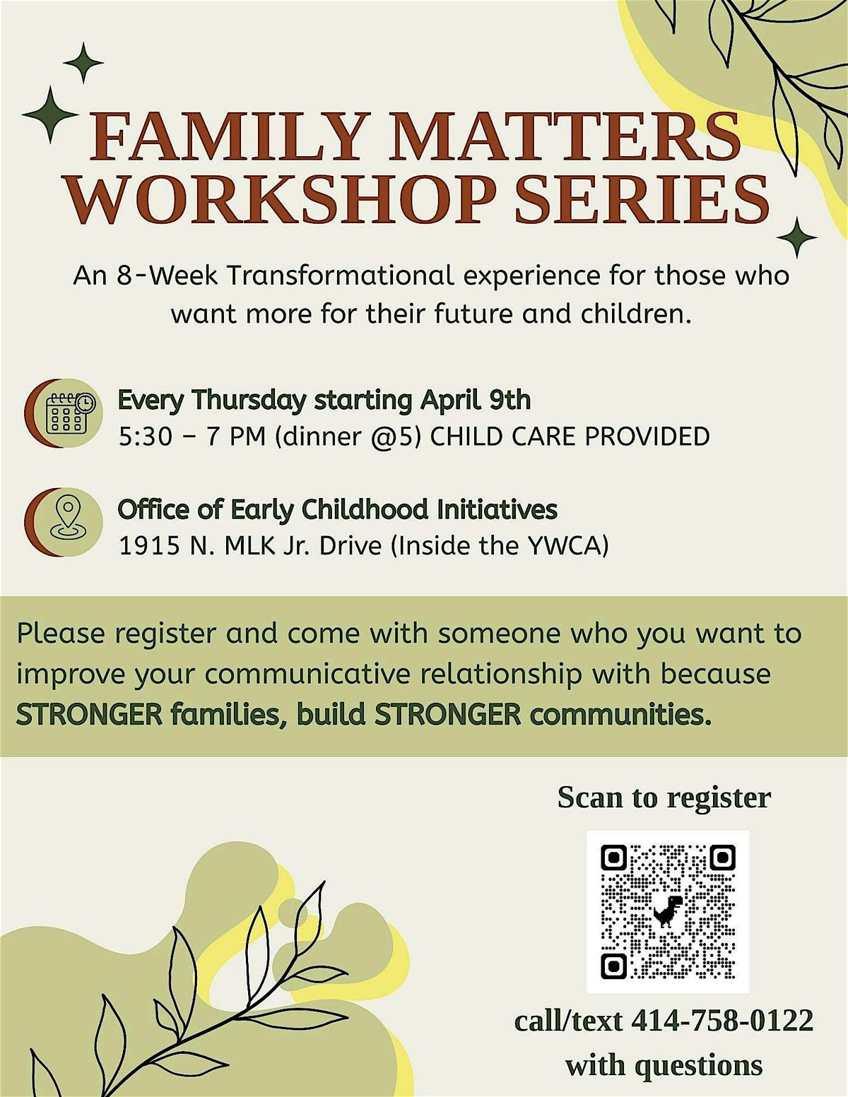 This workshop series requires your attention for 8-weeks starting Thursday, April 2nd. Be ready to bond over a hot meal and meaningful discussions that help us be better parents, co-parents, grandparents and friends. 1. Define the family vision. 2. Build trust, emotional safety, and communication. 3. Move from Control to Cooperation. 4. Create a Culture of Care.