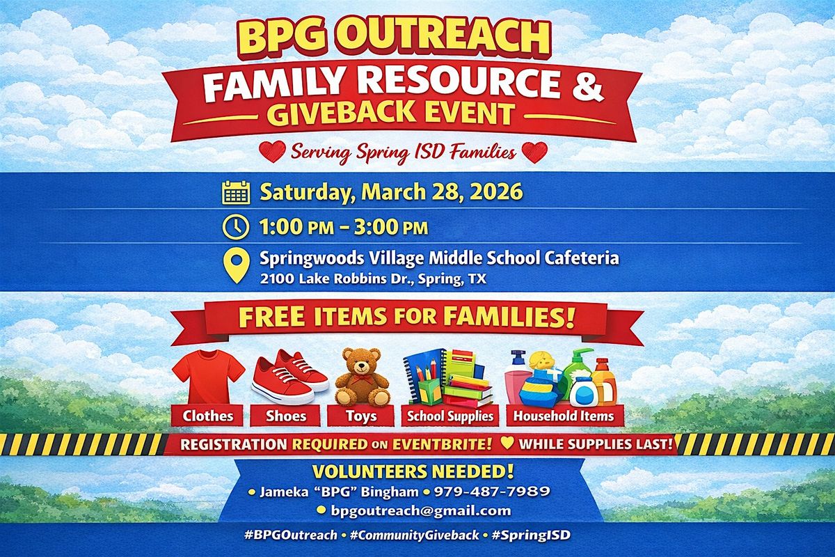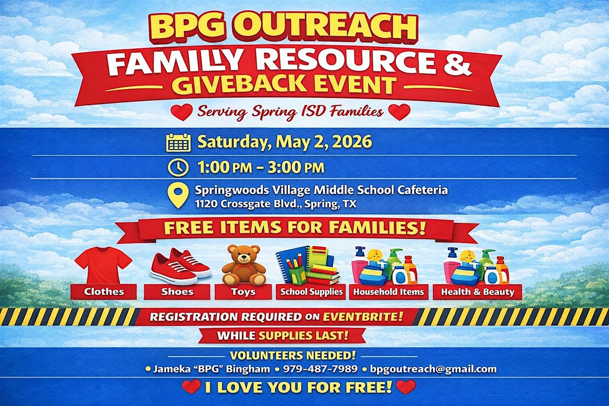 BPG Outreach is excited to serve our community by hosting a Family Resource & Giveback Event for Spring ISD families.