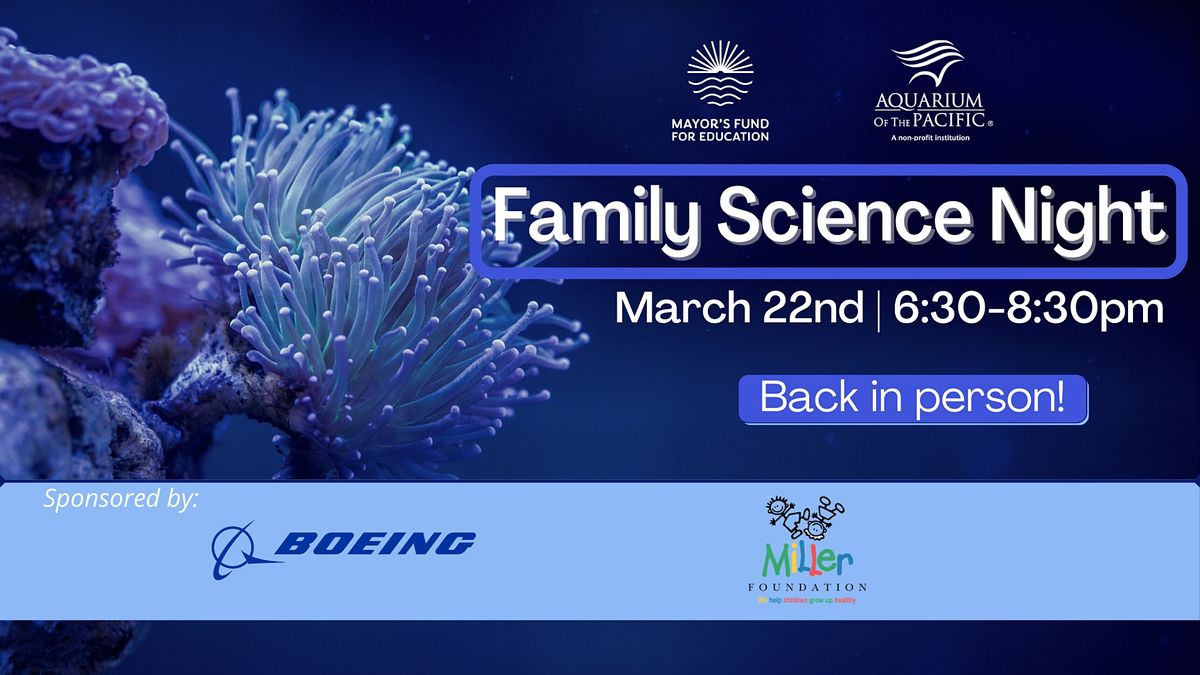 The Aquarium of the Pacific is excited to be having the first Family Science Night of 2022, with support from the Mayor's Fund for Education and sponsored by the Boeing Corporation and Miller Foundation!