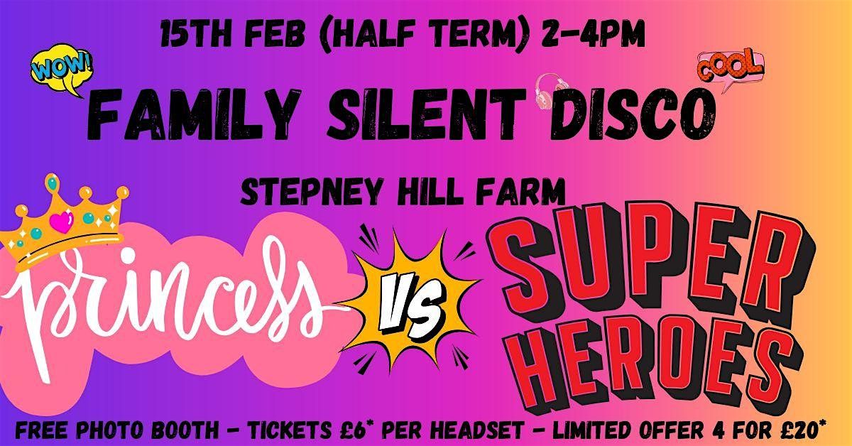 Welcome to the FAMILY SILENT DISCO! Get ready for a february half term showdown between Super Heroes and Princesses at Stepney Hill Farm. It's a family-friendly event where you can dance the afternoon away with your loved ones. Grab your headphones, pick your channel, and let the battle of the beats begin! Which DJ will you choose?