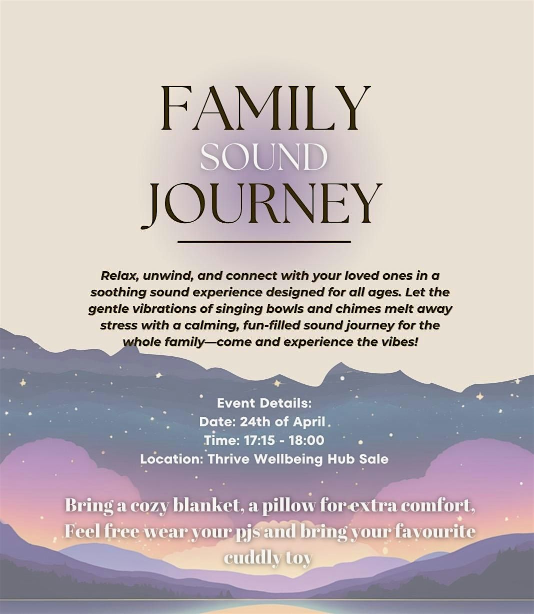 45 minutes of relaxation and fun for the whole family ,children get to experience a sound journey and have a go of the instruments thereselves also leaving with a small gift they get to pick ,introduce your children to the word of wellbeing.