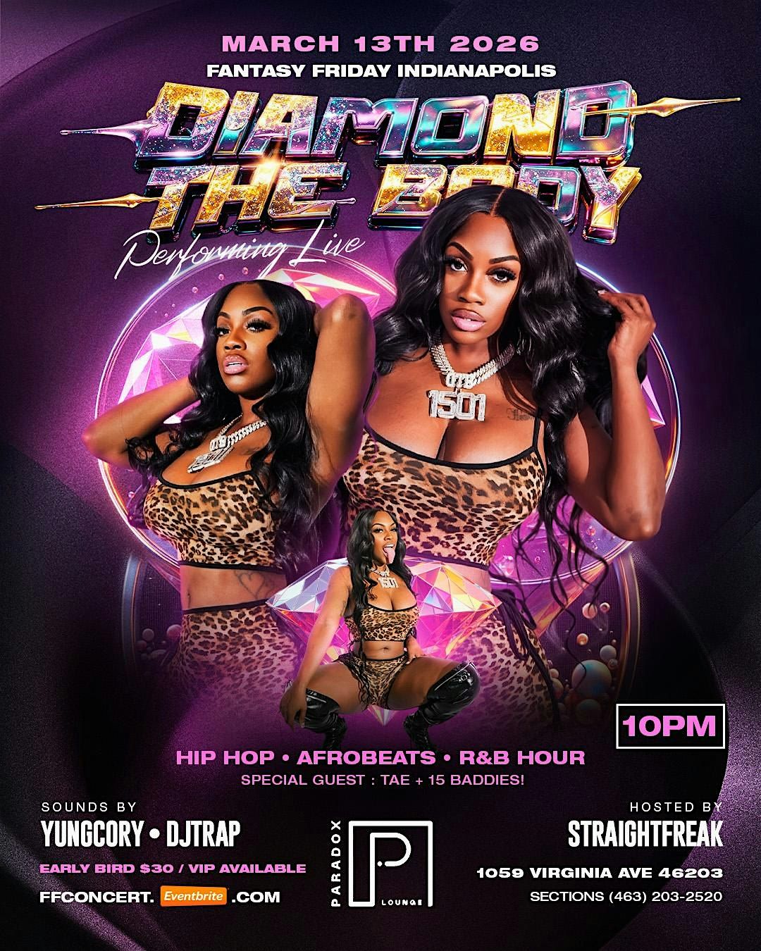 Join us for the DIAMOND THE BODY CONCERT happening live in INDIANAPOLIS! This in-person event is your chance to vibe with awesome beats and an unforgettable atmosphere. Donβt miss out on an epic Friday night filled with music, fun, and good vibes. Gather your crew and come experience the magic of Diamond the Body live on stage!