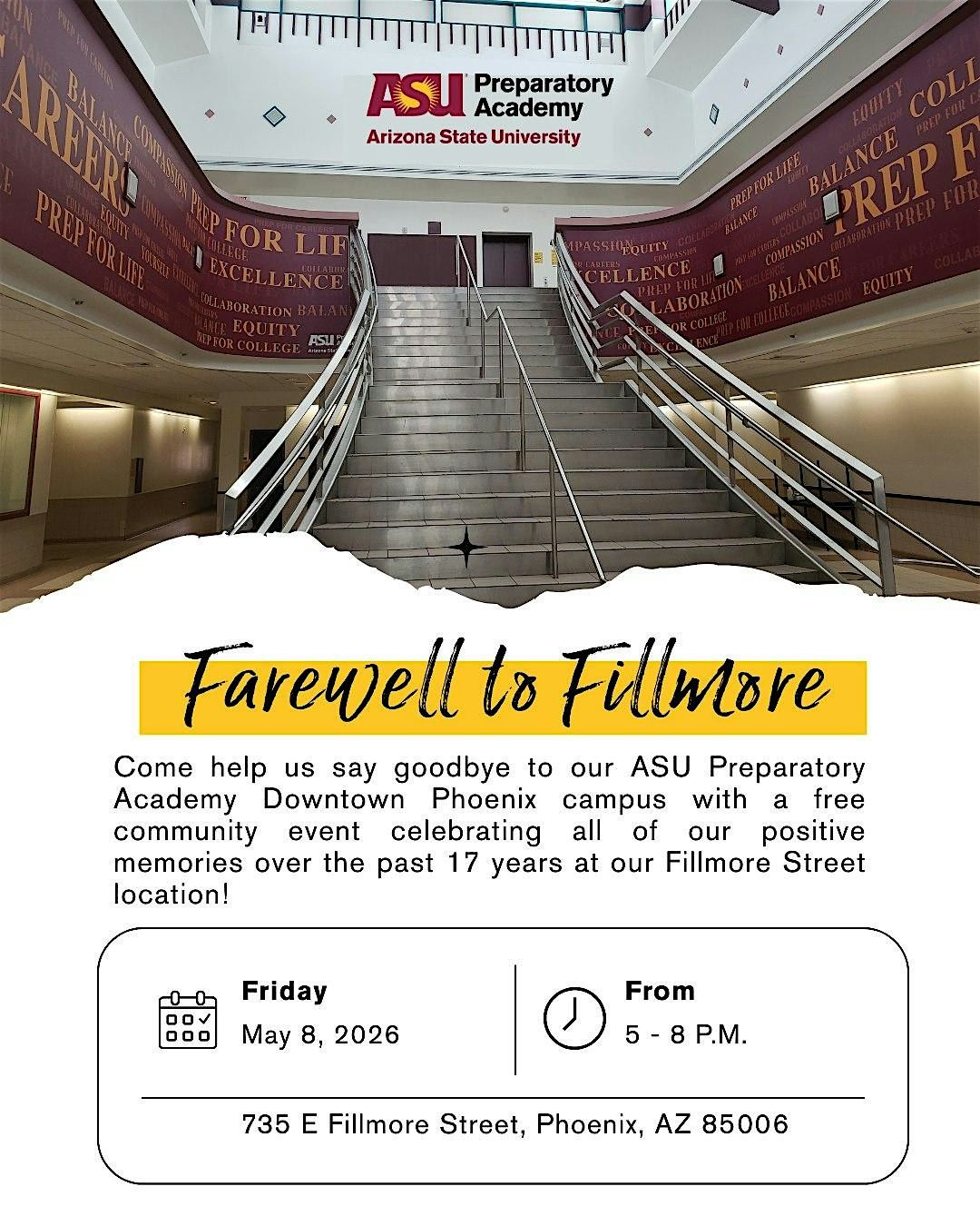 Come help us say goodbye to our ASU Preparatory Academy Downtown Phoenix campus with a free community event celebrating all of our positive memories over the past 17 years at our Fillmore Street location!