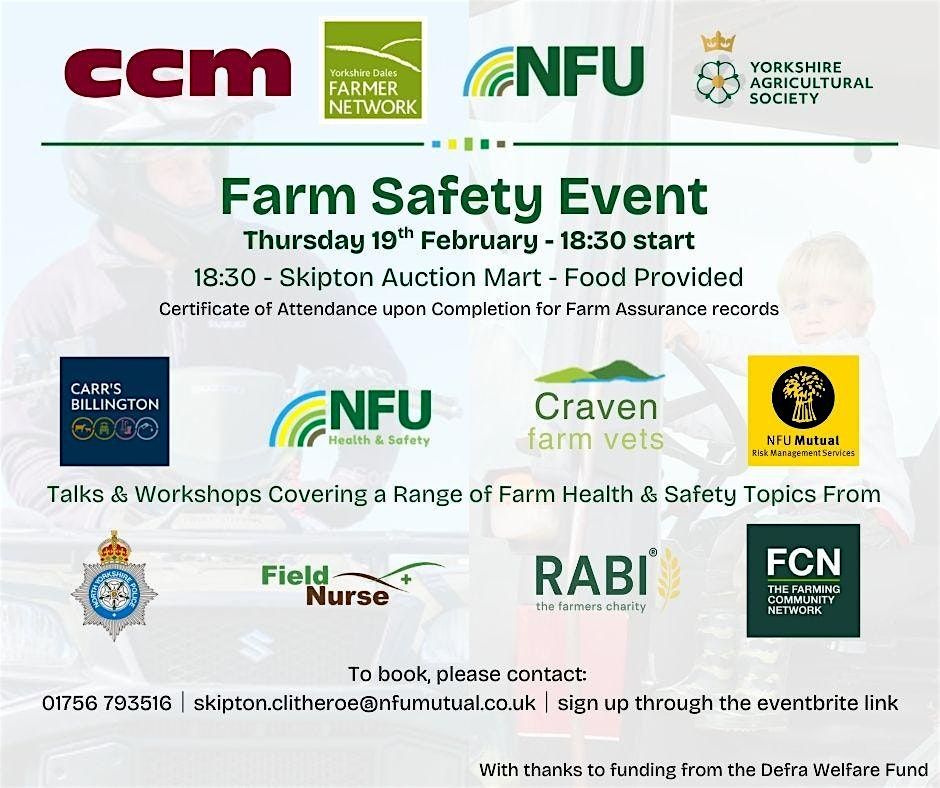 A farm safety evening hosted jointly by The Farmer Network, The NFU and The Yorkshire Agricultural Society at CCM Skipton with stations delivering a range of information from NFU, Carrs Billington, Craven Farm Vets, North Yorkshire Police, FCN, RABI and Field Nurse.