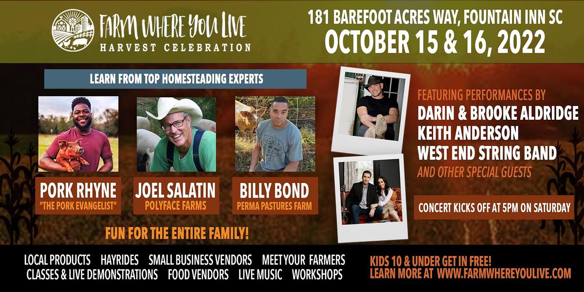 On Saturday, we are having an all-day celebration with games, hayrides, local music, a pie bake-off, and more! Joel Salatin from Polyface Farms will speak in the afternoon and we will kick off our Farm Where You Live Music Festival in the evening.