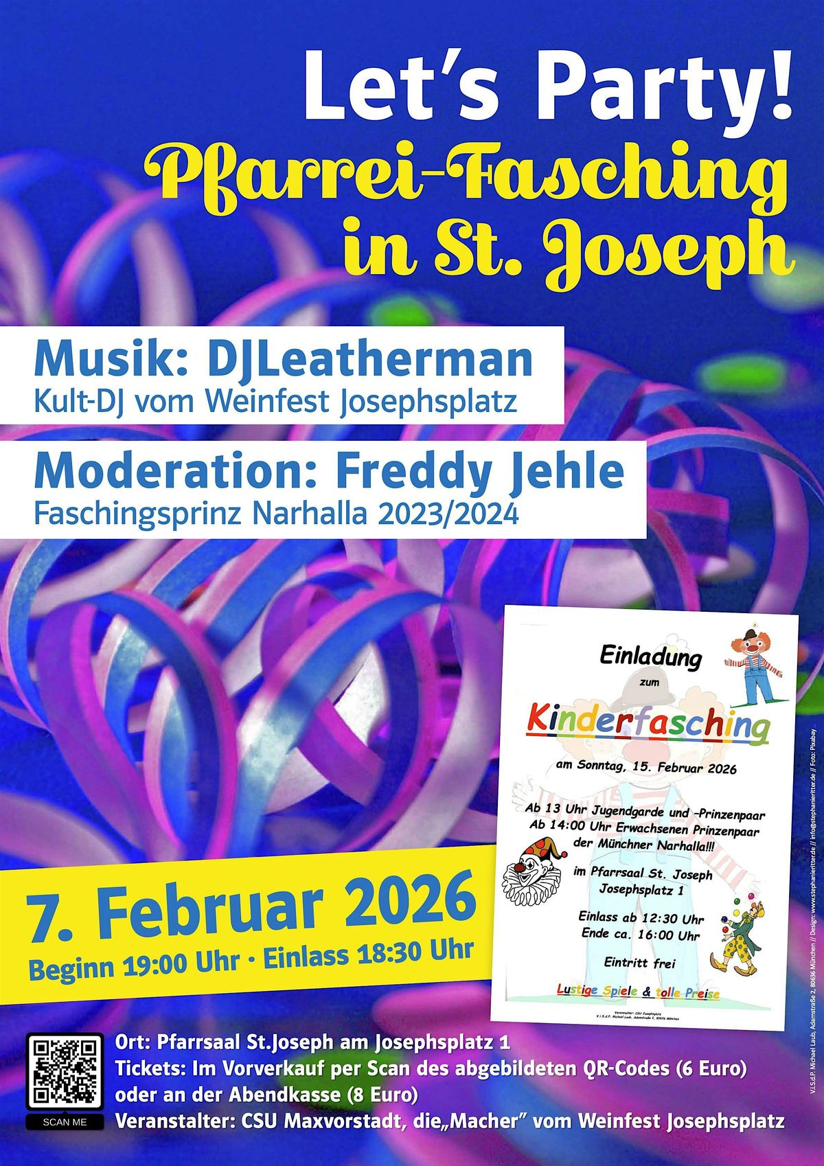 Freut euch auf einen fröhlichen Abend am Josephsplatz 1 beim Fasching der Pfarrei St. Joseph am 7. Februar 2026 um 19:00 Uhr (Mitteleuropäische Zeit).
